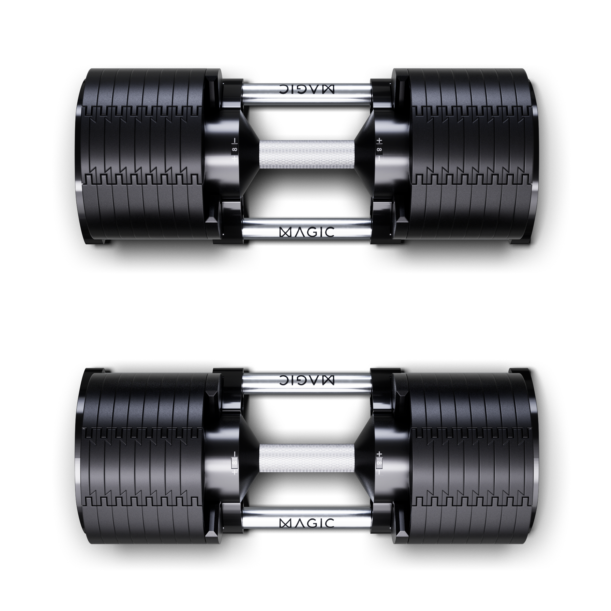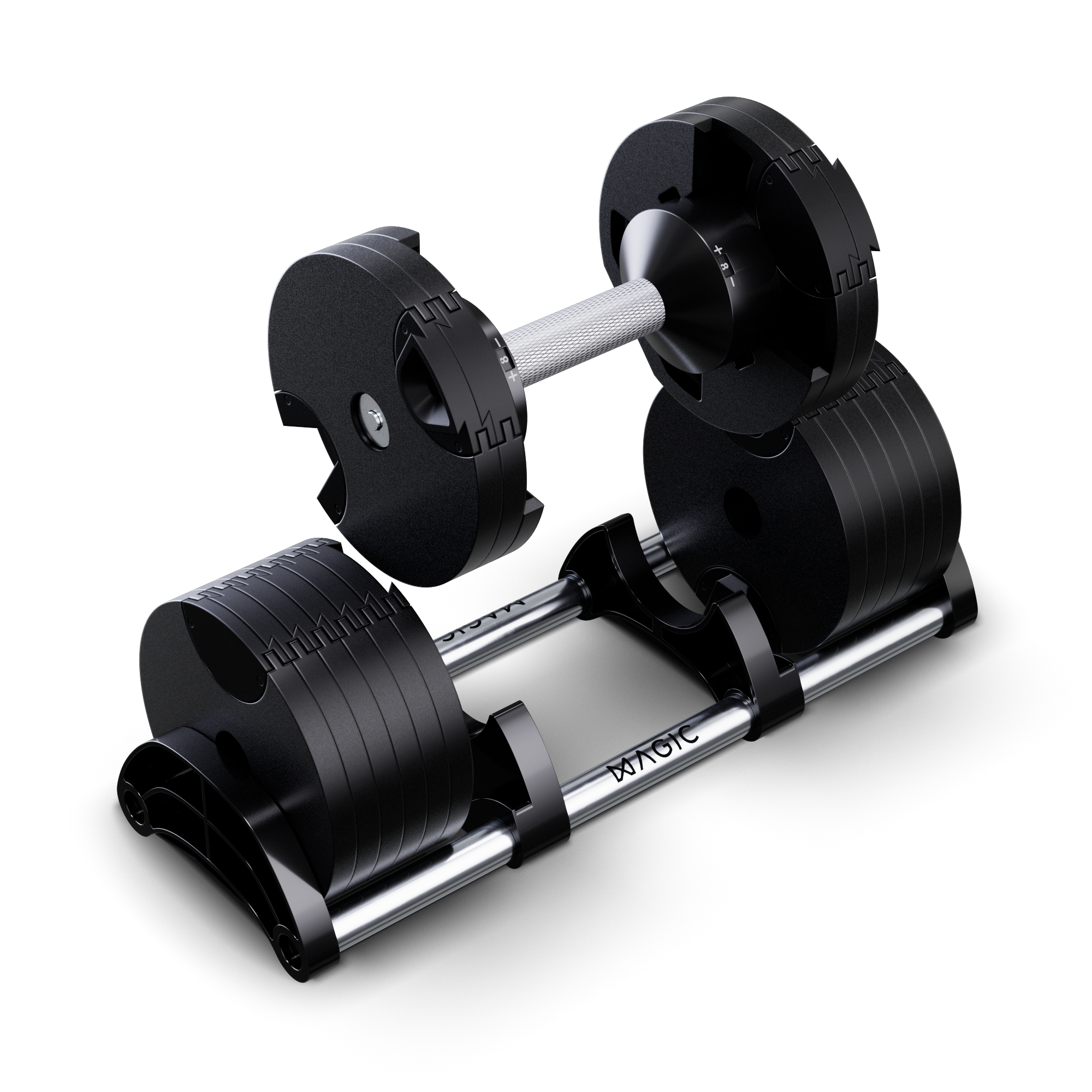 Replace an entire weight rack with a 16-in-1 weights solution. The patent-pending MAGIC smart dumbbells increase from 5lb all the way up to 80lb in 5lb increments ensuring you can progress easily. Together they total 160lb of weight and are easily adjustable with a single twist of the handle.